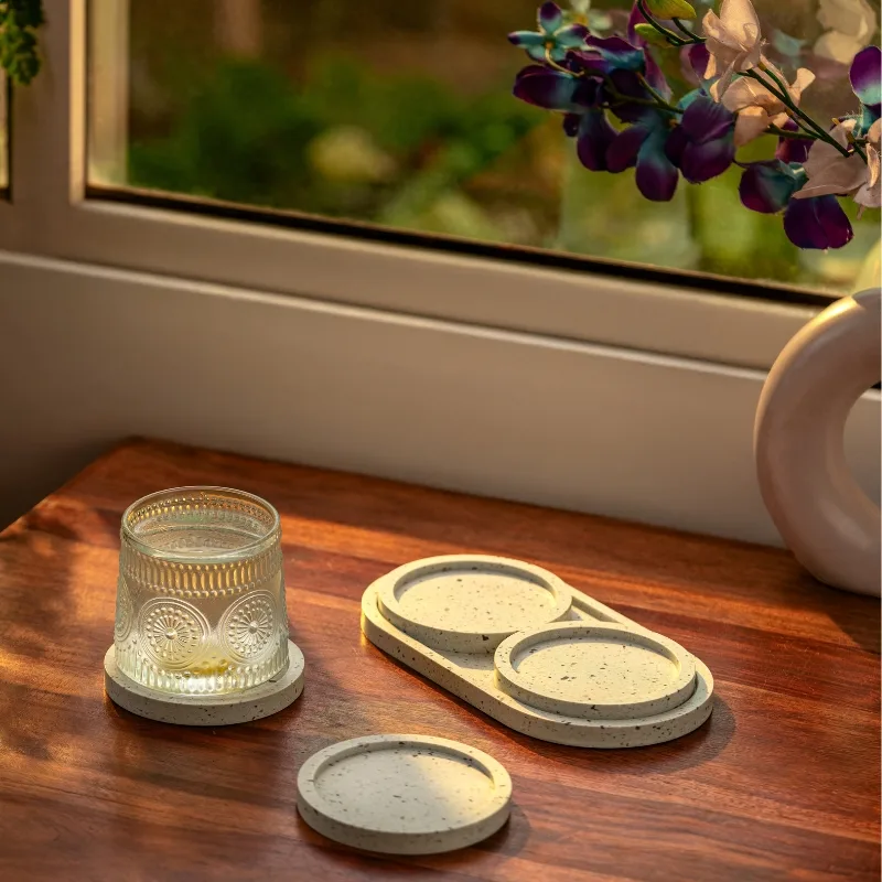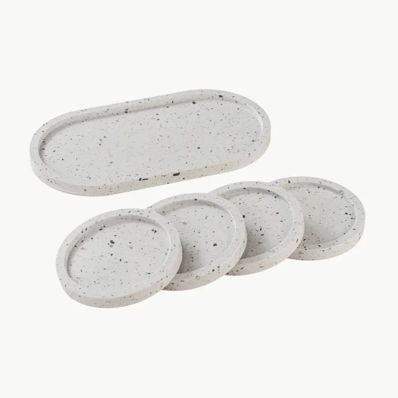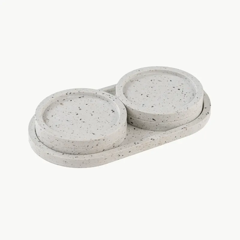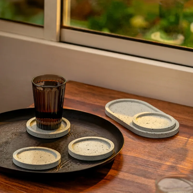 Bold, modern, and full of character — Latte Mix Coasters by Elexra is a striking set of four coasters and 1 tray crafted from DuPont™ Corian® in the rich Excavage color. With a cool light grey base, accented by crisp white grains, translucent fragments, and bold black chips, this set brings a confident contrast and contemporary edge to your everyday spaces.