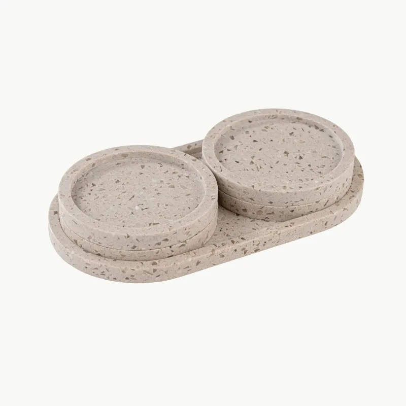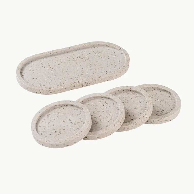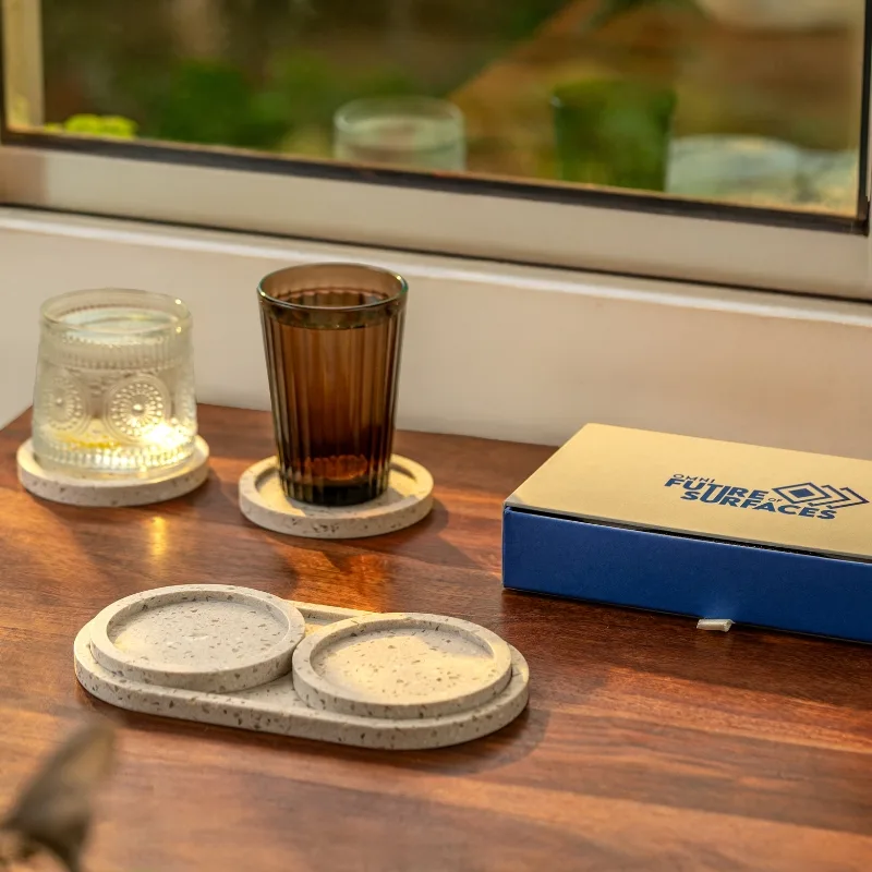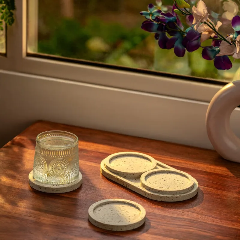 Rooted in earthy calm and the quiet richness of a well-brewed cup, Mocha Mix by Elexra is a warm, grounding set of four coasters and 1 tray crafted from DuPont™ Montelli Cervino Solid Surface. Inspired by the comforting hues of mocha coffee, the coasters feature a sand-toned base flecked with soft white and translucent chips — like subtle reflections of morning light on textured ground.